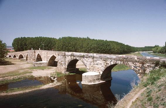 El Paso honorable bridge, located in the town of Hospital de Orbigo in Leon, is one of the longest bridges of The Way of Saint James that crosses the Orbigo River. It has 20 arch shaped spans of different types, with lightening small arches in one of the central sections.