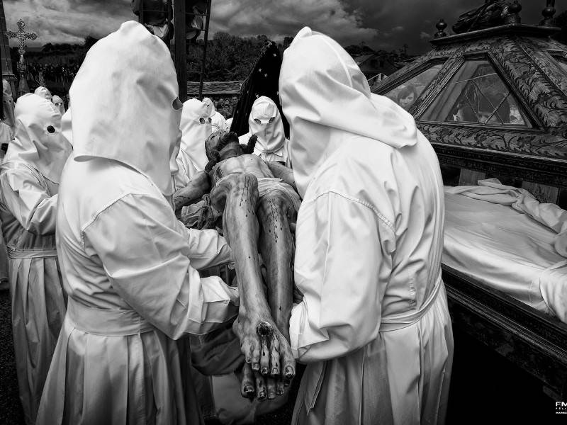 下午 4 点左右,身着白色亚麻长袍(下葬当天将作为裹尸布)的教友们离开教堂,走向广场,唱着令人心碎的《上帝啊,宽恕》。他们聚集在基督和圣母的雕像周围,教区牧师开始发表"下山布道",这是每年一次的独特演讲,结尾总是相同的仪式:打开基督雕像。基督雕像是 Bercianos 教友们收集的 19 世纪雕刻品,放在十字架下。他们将雕像献给他们的母亲——悲伤圣母,然后将其放入玻璃瓮中,直到下一个耶稣受难日。就这样,随着被钉在十字架上的基督倒下,圣葬游行开始了。